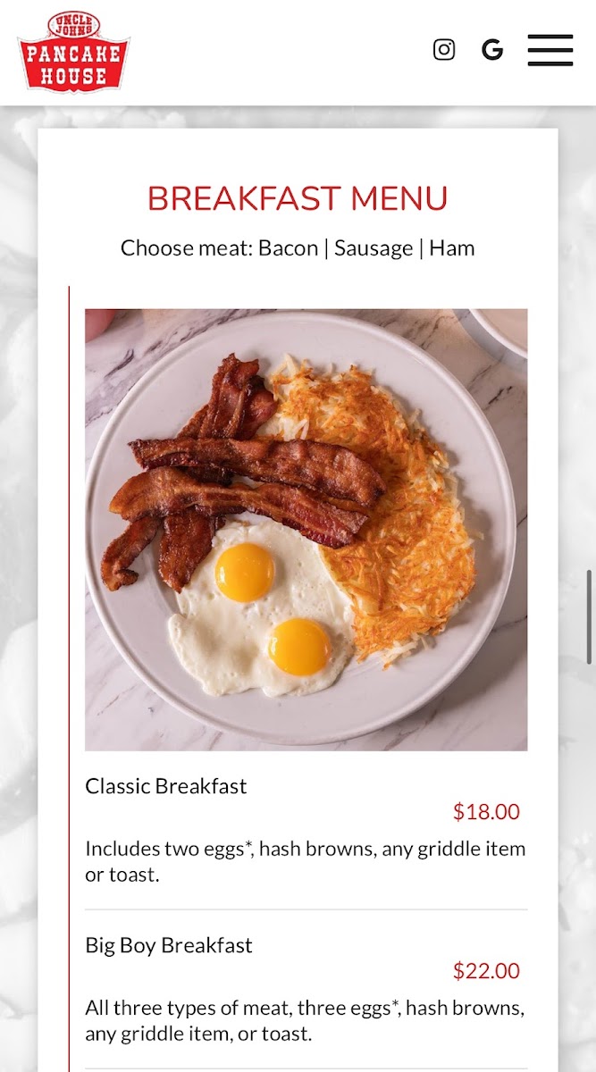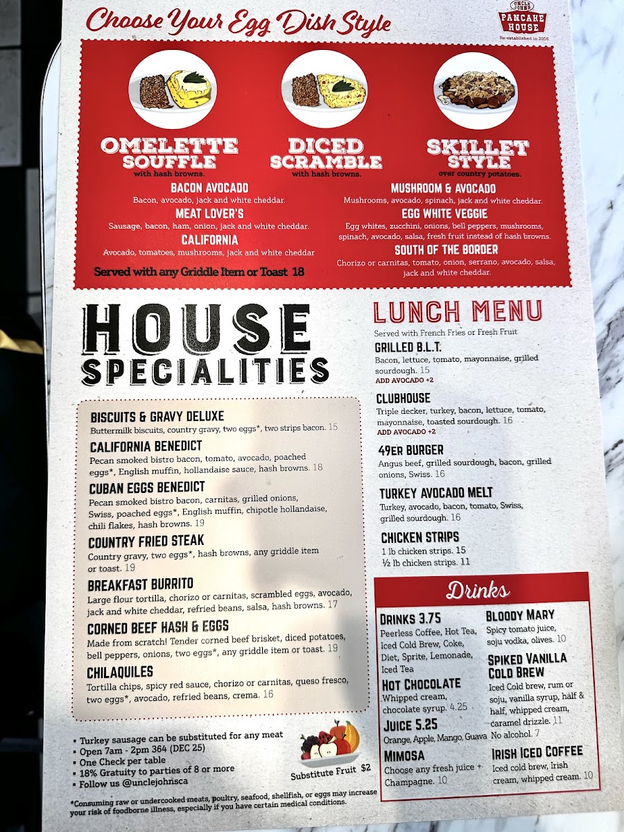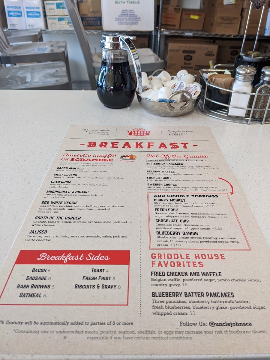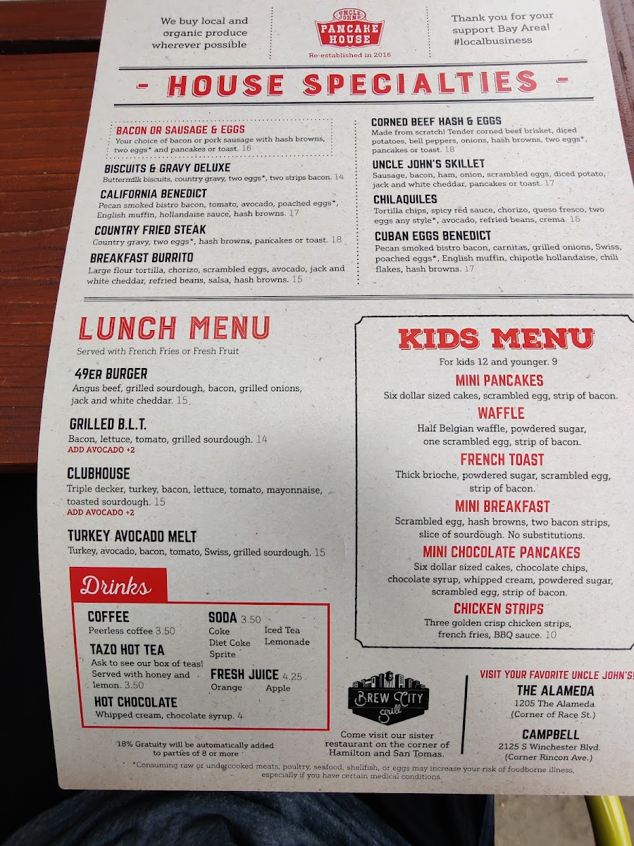The Uncle John's Pancake House Menu is packed with classic breakfast comfort and hearty options that will have you coming back for more. Whether you’re in the mood for a stack of golden pancakes or something a bit more savory, there’s something here for everyone. Located at 1205 The Alameda in San Jose, CA, this cozy spot is known for serving up fresh, made-to-order meals that hit the spot any time of day.